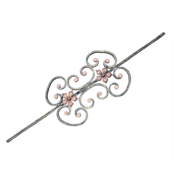 Wrought iron ornaments using 10×10 mm plain square bar. SNUB scroll ends, Height: 914 mm (3′), Width: 270 mm (10.8″) Weight: 2.9 kg.